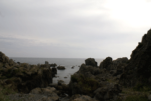 左より 大師修行の場と伝えられる洞窟、洞窟の中から外を見る、室戸岬の風景