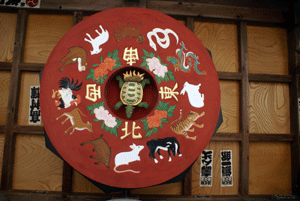 左より 栄かえるの像(左側2枚)、山門の天井にはこんなものが・・・