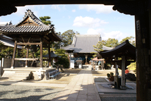 左より 境内南の川岸より山門を望む 山門 鐘楼と本堂(大師堂は現在新築中でした)