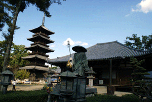 左より 山門から境内を望む 本堂(国宝) 本堂と五重塔