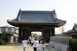 左より 本堂、大師堂と多宝塔 山門に向かうお遍路さんたち