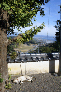 左より 鐘楼の鐘の下には大きな穴がありました、眺めは最高!、納経所からの眺め(飼われている犬が気持ち良さそうに寝ていました)