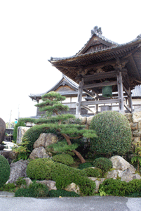 左より 駐車場脇の築山、参道、本堂(奥)と大師堂(手前)
