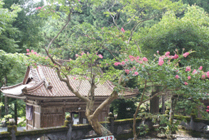 左より 山門、本堂(右脇にサルスベリの樹があります)、樹齢100年以上のサルスベリの樹