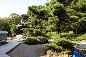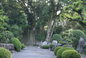 入り口の庭園は見事で、中腹には巨大な楠が参道の石段に覆いかぶさる様にそびえます。