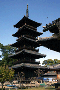 左より 山門から境内を望む 本堂(国宝) 本堂と五重塔