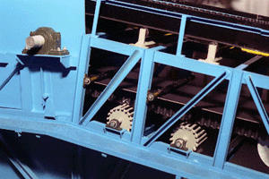 パワーブラシクリーナ、V型スクレーパ、逆転防止器のプレート (後方はベースベルト)